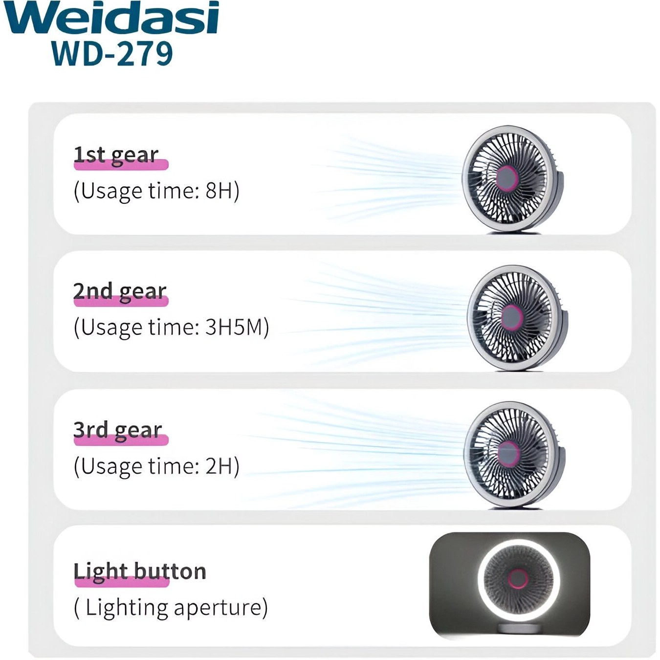 پنکه چراغ دار رومیزی برند WEIDASI محکم و فوق العاده، حجم و فضای بسیار کمی را اشغال می کند. به همین خاطر می توان همیشه آن را همراه خود داشته باشید. حمل آن آسان و بی دردسر است. این پنکه چراغ دار شیک و باکلاس قابلیت چرخش تا زاویه 360 درجه به هر چهار طرف خود را دارد. میزان ایمنی این پنکه قابل تحسین است. این پنکه شارژی یو اس بی USB و کوچک ماشینی بسیار کم سر وصداست. به طوریکه از هوادهی آن لذّت می برید. منبع تغذیه آن پورت یو اس بی USB تایپ سی TYPE C است. طول کابل یو اس بی آن 100 سانتیمتر است. پس به راحتی به شما این امکان را می دهد که محل پنکه را به صورت دلخواه انتخاب بکنید.